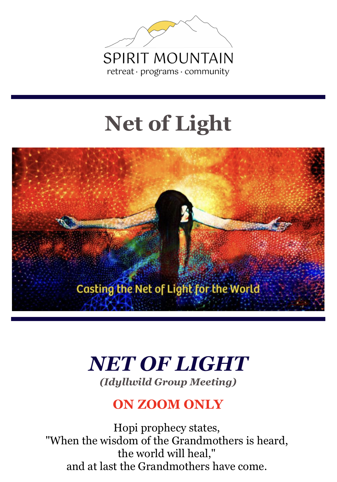 We come together to learn how we may be of greater and greater service, to become, as the Great Council of the Grandmothers says, "A Walking Blessing Upon the Earth."