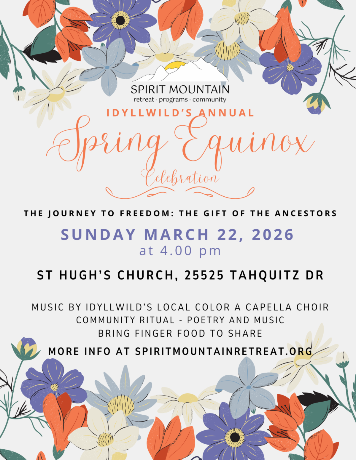 For more information, call Spirit Mountain at (951) 634-4048 or via email.